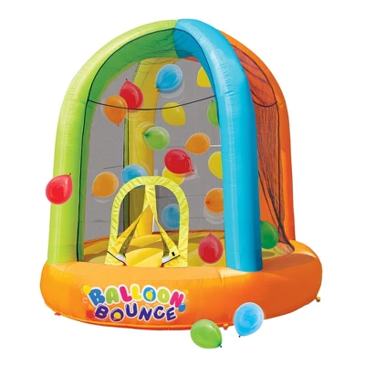 Keep the kids active and entertained with the Banzai Inflatable Balloon Bounce Activity Play Center.The inflatable play center combines elements of a classic bounce house with a balloon twist. The outdoor play structure will safely and conveniently inflate in under 1 minute with the included GFCI blower motor. Then, simply throw in the balloons you inflated with the included hand pump into the house, and the built-in air jets will keep the balloons circulating for endless fun. The mesh walls allow you to keep an eye on the tykes for added safety, and the mesh door with velcro enclosures allows for easy access so your kids can come and go as they please.Never have to worry about stability as the included stakes can help pin and hold the slide down. Constructed from heavy-duty Dura-Tech material, experience the ultimate durability for long-lasting use and years of play. In case you want to bring the bounce house with you on the go, feel free to place the inflatable playground in the included portable storage bag for convenience.Have the kiddos invite their friends and enjoy bouncing on the Banzai Inflatable Balloon Bounce.