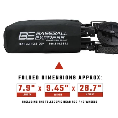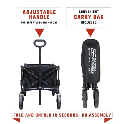 Carry your gear in a breeze with the Collapsible Wagon from Baseball Express. With an outside dimension of 34.5 inches long, 16.5 inches wide, and 36 inches tall, our collapsible folding wagon has a large capacity, allowing you to haul multiple items without making too many round trips. This multi-purpose wagon sets up in seconds and requires no assembly for a fuss-free, reliable tool that you can use in your house, garden, yard, or any outdoor activity. Our portable cart is created with heavy-duty fabric, supportive metal bars, and four sturdy wheels to bear heavy loads and ease the burden of transporting large or bulky equipment. With a telescopic rear rod, you can adjust the handle height of our utility wagon to get the comfort you need when pushing or pulling. Our collapsible cart folds to 7.9 inches long, 9.45 inches wide, and 28.7 inches tall and includes a travel case for convenient transport when using it as a beach wagon, grocery cart, camping wagon, or fishing cart. For the safety of children, this folding wagon is only meant to transport gear and equipment. With a large capacity and sturdy construction, the Baseball Express Collapsible Wagon is a versatile and easy-to-use tool for hauling items on the go.