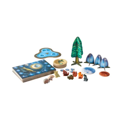 Enhance the world of Photosynthesis with the Under the Moonlight expansion! The moon turns in the opposite direction of the sun and casts its moonlight into the woods. Players collect lunar points for their new forest animal to activate special powers. Which one of the 8 animals will be yours? The boar collects trees, the hedgehog plants seeds, the fox steals and moves seed around, the owl turns lunar points into sun points… Strategically position your animal by the moonstones, activate their capabilities at the right time, and be careful to not stay too long in the shadow of the Great Elder Tree! This expansion requires the base game Photosynthesis to play.Contents:1 Great Elder Tree1 Full Moon/ Half-Moon token1 Moon Phase tracker8 Animal meeples4 Lunar Point trackers1 Dam tile (for the beaver)8 Baby Turtle tokens3 MoonstonesIllustrated Rules