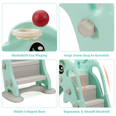 3-in-1 multi-functional slide is equipped with climbing ladder, slide and basketball hoop