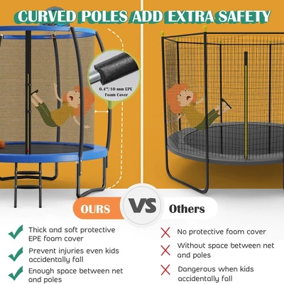 - Safety Always Comes First: Giantex trampoline meets the ASTM standard to ensure high quality and reliable stability. Comparing to those trampoline with straight poles, the trampoline specially designed with curved poles can prevent injuries when kids fall down. The safety enclosure with safety buckles and double-headed zipper will fully protect kids’safety during jumping.
