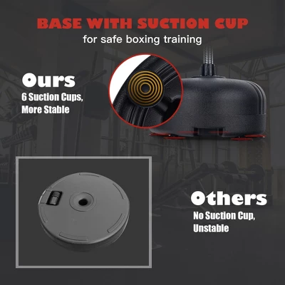 - Firm Base & 6 Suction Cups: The base of this reflex bag can be filled with 28L of water or 70.5lbs sand to increase stability. Other than that, the base is designed with 6 suction cups to ensure that it can be kept in place on various grounds such as lawn, wooden floor, tiled floor, carpet and more during fitness.