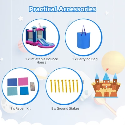 - Complete Accessories: The package includes 8 bouncer stakes, 1 repair kit, and 1 carrying bag. You can firmly secure the bounce house to the ground with stakes. A pack of repair kit is prepared for any uncertain damage. (Note: suitable for 3 children aged 3 – 10 years old to play together, max. weight limit of inflatable part: 300 lbs, individual weight limit: 100 lbs)