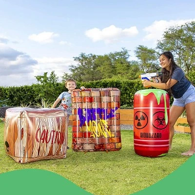 Create Your Own Battle Zone: Our inflatable battle set includes 3 colorful obstacles (box, wall, barrel) to take your party to the next level. Dart blaster play, laser tag, or water gunfights. Easy to Set Up & Durable: Inflate and deflate in minutes with any air pump. Heavy-duty construction stands up to the toughest battles. Adhesive patches included to repair any holes.