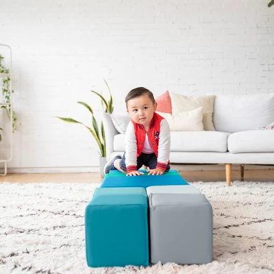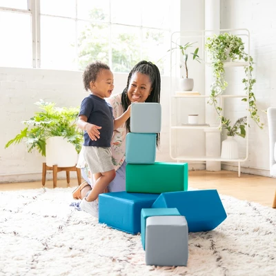 Learn through play with the SoftZone Big Foam Building Blocks. The set of seven colorful oversized play blocks will engage little ones with open-ended play and encourage manual manipulation and color recognition. Designed to grow with children, the foam building blocks can be used on an activity mat for babies and grow into building blocks for toddlers. The large foam pieces can be stacked to create different shapes and structures and knocked down to create your next masterpiece. Allow kids to take a hands-on approach to learn while encouraging problem-solving, critical thinking skills, and collaboration as they build with increasing complexity. Three shapes are the perfect size for children to carry, stack, toss, and build towers in preschools, and early childhood learning environments and are perfect for the home. Soft and lightweight, these modular quiet blocks fall over without making loud crashes. The soft foam core of each piece is covered in vegan leather. Soft blocks arrive fully assembled allowing for more time to play. Set up a larger play area for safe indoor active play and create fun color-matching games and patternmaking by pairing them with ECR4Kids SoftZone Activity Mats and Climbers; sold separately. | ECR4Kids | 16″L x 16″W x 24″H | SoftZone 7-Piece Big Block Set |