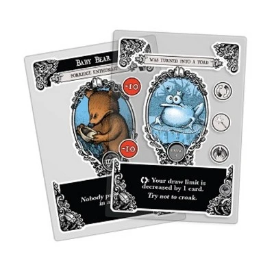 Fairy tales are awful. Wolves and old women eat children, giants fall from the sky, and even young girls break-and-enter to steal porridge from unsuspecting families.In Fairytale Gloom, custom collections of fairy tale characters like Jack, Gretel, Puss in Boots, and Little Red Riding Hood do their best to stay happy, but circumstances conspire to rain woe on their sad, benighted heads.These heroes become beasts, give up on Grandma, and cry wolf once too often. Even though they look into magic mirrors and kill golden geese, most end their days living in giant shoes… or worse.Eventually, enough Unhappy Endings come to pass that the game ends. And then? The most miserable collection of characters wins!Gameplay Basics:Each player chooses their own collection of fairy tale protagonists.Modifiers add or subtract points. You could play Dwelt With Some Dwarfs on Rapunzel, for example.Unhappy Endings lock in points for good or ill. Perhaps Goldilocks Cried Wolf Once Too Often. It’s all about storytelling: Players weave tales around what comes to pass. What happened, exactly, when Joe the Giant Married a Murderer? With transparent cards, the points you can see are the points in play it’s that simple!