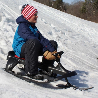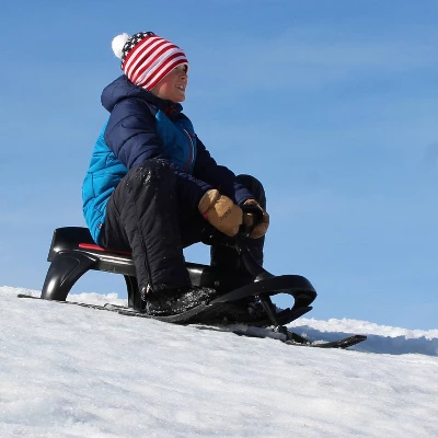 Cool, fast sled with fully functioning steering wheel and skis is sure to attract a lot of attention at the hill! Everyone will want a turn on this awesome sled! The steering increases the fun and the spring activated braking system increases the riders control. This rugged sled is made of polyethylene. There is a red foam pad on the seat for added comfort. An easy snap-in assembly is required, and instructions are included. Recommended for ages 8 years and up.Â