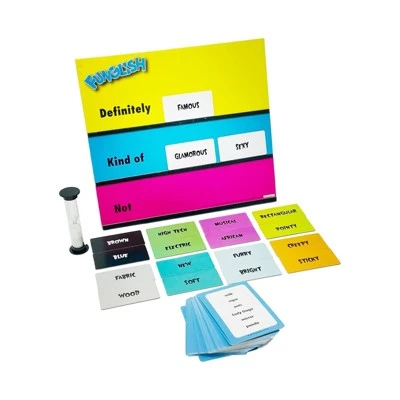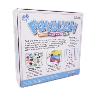 Funglish – express it and guess it with piles of tiles! Grab and place fun and revealing clues on the word board as quickly as you can. See how fast you can get the other players to guess your secret word using only descriptive tiles. Now quick – can you get another secret word revealed before time runs out? You have six different secret words to get across on each turn. Find the best descriptive tiles and win. It’s definitely red and edible. Kind of wet and liquid. Not living, sweet, or sour. Right, it’s ketchup! You and the guesser each score one point.