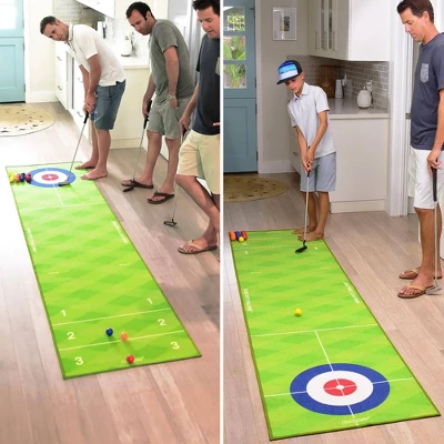 - PURE PUTT CHALLENGE: Shuffleboard & Curling meets golf in this 2-in-1 putting game! Full game includes 1 premium 10ft putting rug with Curling on one end and Shuffleboard on the other, 16 Golf Balls and Dry Erase Scorecard