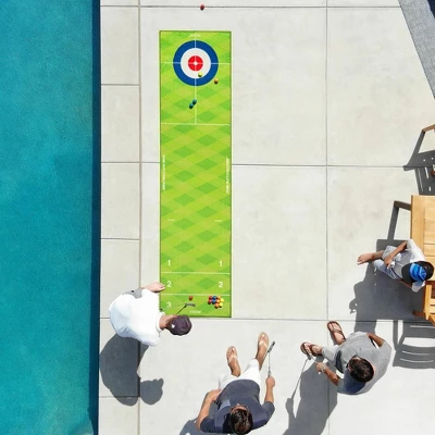 - PREMIUM WOVEN RUG: Rug features shuffleboard scoring markings on one end & curling on the other and is made to roll like a real putting green – easily roll out for setup and roll up for compact storage