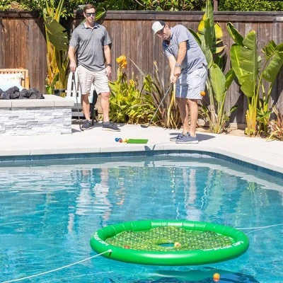 - Set includes inflatable Splash Chip target, 16 foam golf balls, 1 golf chipping mat and 2 tethering ropes for fun games