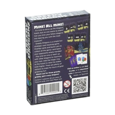 It’s time to divvy up the dragons’ hoard, but no one wants to share! Can you trick your fellow dragons into leaving you with the most treasure?Greedy Dragons is a simple but strategic card stacking game. Overlap cards and build Lairs to collect all the gems—and leave your opponents empty-handed!Play one-on-one or team up with other dragons to maximize your loot. Add the magic ring to the hoard to raise the stakes even higher. There are plenty of options to make for hours of gold-grabbing fun!