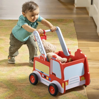 If your little boy or girl dreams of growing up to be a firefighter, give them an early start to feeling like a hero with our Wooden Fire Truck Walker and Push Toy! This durable, colorful truck measures 17¼”L x 15″W x 19¾”H, the perfect height for toddlers and beginning walkers (ages 12 months and up) as they gain confidence learning to walk and explore their world! This lightweight walker/push toy features easy-rolling, soft, non-marking EVA wheels that won’t damage your floors, so it’s perfectly safe for indoor use, and easily transported from room to room. The handle is at the perfect height for toddlers, and hanging from that handle is a small swinging bucket to keep much-needed snacks or tiny treasures. Kids can even store blocks, toys, blankets, and other special items in the truck’s compartment. Easy adult assembly takes approx. 10 minutes.
