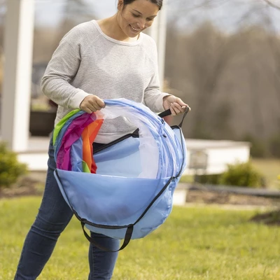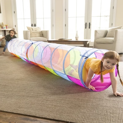 Create an indoor or outdoor maze, add to an obstacle course, play hide and seek, or just hang out in the spacious breezy pieces—our Pop-Up Rainbow Play Tents and Tunnels offer hours of play, indoors or out! The cheerful rainbow colors will stand out in the backyard, or complement any playroom or kids bedroom. And because they’re made of durable polyester, they’re tough enough to use outdoors (8 ground stakes included for extra stability; please store indoors when not in play). The 4 different playing pieces (2 tunnels and 2 tents) can be connected with the attached toggles, or separated for independent play. 5’L tunnels are mesh-topped for breathability and visibility, and are wide enough (1¾’ diam.) for kids to scramble through quickly. The spacious playhouse tent (3½’ diam. x 4½’H) features a roll-up door and 2 tunnel openings—4 poles are included for quick assembly. With an opening on all sides, the 2½’ cu. tent can attach to any of the components on any side—so there’s multiple play configurations possible. Want to take these portable play pieces on vacation, to the beach, or to the campground? Just remove the poles from the playhouse tent, twist & fold the components, and pack them in the convenient mesh carrying bag. Easy-peasy play on the go!
