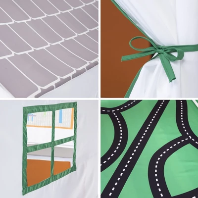 - Spacious 44″L x 44″W x 50″H polyester play tent with sturdy plastic poles has tie-back doors, open windows on the side, and a colorful floor with a road pattern