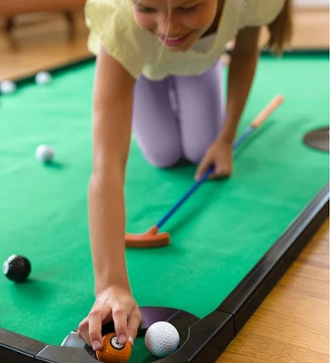 Get the whole gang in on the fun of our Golf Pool Special-an exciting family game that combines the challenge of golf with the game of pool. Perfect for beginners and experts alike! Just roll out the green mat (similar to that of traditional pool table tops) in the den, finished basement, or any level surface indoors. Attach the rails along the edges, and take turns putting the balls into the pockets. It’s that easy! It’s a great way to help kids build hand-eye coordination, strategic thinking, and family memories. Also great for play dates and family parties! Set includes green mat, carbon fiber golf clubs, 16 golf balls, rails, two arches, and two ramps. (Arches and ramps are made of wood and brightly colored for extra fun.)
