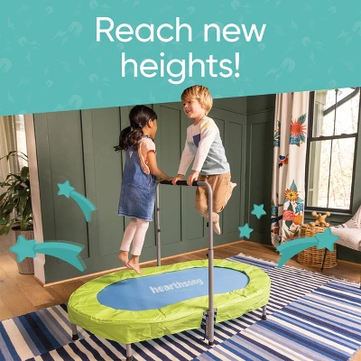 Bounce off the walls with Hearthsong Jump2It Indoor Trampoline with Adjustable Handle! The 56”L x 35”W x 9”H open-space ship features a 43”L x 24”W polypropylene jumping mat, 24½-35” foam-padded handles, and non-slip feet. In other words, you can feel secure and safe in reaching new heights—or ceilings—of space exploration! Fly solo on your space mission or share the operation with a fellow astronaut. And remember, the weather has got nothing on you or your space pad; it’s always sunshine on this side of the deck!