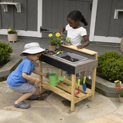 Host a mud-pie party, make some slime, or fill the tub with water for splish-splashy fun – this multi-purpose sensory play station does it all! Our Jr. Chef’s Wooden Mud Play Kitchen and Imagination Station is a pretend-play kitchen, science experiment station, and sensory play space all in one durable play structure. It even comes with a 6-piece metal accessory set (pot and pan with lid, bowl, ladle, and spatula) to accompany kids’ outdoor picnics and parties. Constructed of sturdy cedar, this 25″L x 15″W x 27″H attractive play set features 2 printed-on pretend burners for imaginary cooking, and 3 hooks to hold towels or kitchen accessories. The removable plastic tub sink holds up to 1 gallon of water or 16 lbs. of sand – or fill it with pebbles for even more sensory fun! It’s also the perfect place to make slime (without making a mess in the kitchen) or perform science experiments. Post menus or prices (or just doodle) on the chalkboard surface (chalk not included). And there’s plenty of storage space for utensils, accessories, or nature’s ingredients on the roomy bottom shelf. For indoor or outdoor use. Adult assembly required.