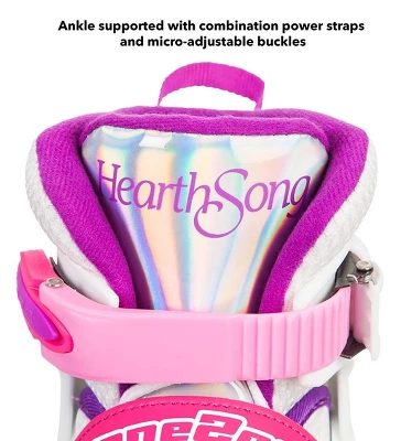 Take a lap in our One2Goâ„¢ Adjustable Roller Skates–fashion forward and ready to jam! Skates dazzle with pink, purple, and white Mylar trim, and thick, padded tongues for comfort. With push button ease, skates adjust to fit kids’ whole sizes 1-4. Skaters are supported at the ankle with combination power straps and micro-adjustable buckles. ABEC 5 bearing rollers offer smoother, easier, and faster skating. Breathable mesh uppers keep serious skaters on the rink at the head of the pack! Skates clean up easily with soap and water.