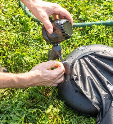 Spare, split, or strike—slip and slide down our giant 18 Foot Strike Zoneâ„¢ Bowling Water Slide for a new twist on backyard water play that’s sure to be right up your alley! Fun-loving kids become speedy human bowling balls when they hop on one of the inflatable speed boards (two included) that are designed with cool bowling ball details like finger holes. The 18’L bright blue heavy-duty PVC water slide with 6″H inflated side bumpers has a sprinkler running down the left side of the lane, keeping kids cool and soaked on the ride which ends in a 6’W splash pool. Four inflatable bowling pins suspended from the arch near the end of the slide reset automatically when kids blast through! Set up the silly cross-eyed extra Spare Me pin (which can be weighted with water) anywhere on the slide, or in the splash pool, for an extra target to hit! No gutter balls here-just backyard fun for hot summer days! Six ground stakes and vinyl repair patch kit included. Quickly and easily inflate and deflate with 2-stage valve (Electric Pump, 733454, sold separately); attaches to standard garden hose. Max. weight 110 lbs.