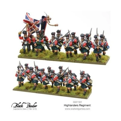 The Highlanders were good soldiers, showing great discipline and hardiness on the march. The Scots proved themselves time and again as doughty fighters – as adept with the Brown Bess musket as with their fearsome use of the bayonet in hand-to-hand fighting.The Highland regiments considered themselves a cut above other county regiments and their distinctive plumed bonnets and swinging kilts marked them out to an enemy as a unit to be avoided if at all possible. The skirl of the bagpipes could carry a long way over the battlefield, encouraging these fearsome warriors, and demoralizing their foes.They were reputed to have run alongside the famous Scots Greys cavalry charge at Waterloo, clinging to tails and stirrups to carry themselves into the enemy faster – Scotland forever!No wargames army of the period is complete without a brigade of these remarkable troops. Black Powder players will appreciate their firing and melee skills, whilst their opponent will groan with despair when the ‘ladies from hell’ march towards them, sporrans swinging, colors flying and pipes skirling.Contains:20 metal British Highlander Line Infantry.4 metal command miniatures: officer, piper and two ensigns with wire flagpoles and finials.Background guide including six full-color flagsMiniatures are supplied unpainted and assembly may be required.