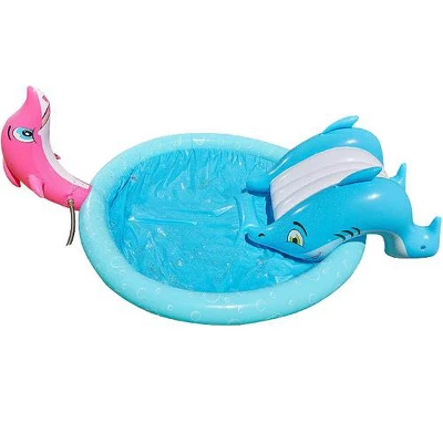 - Our inflatable kiddie pool comes with a built-in dolphin-themed sprinkler and a slide facing the sprinkler.