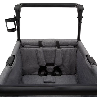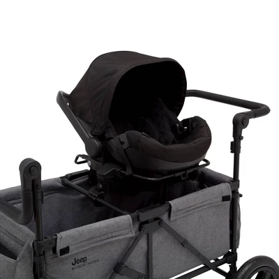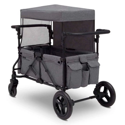 The Jeep Wrangler Stroller Wagon by Delta Children is ready to tackle any family adventure. Designed with all the conveniences of a double stroller and the rugged durability of a wagon, it’s a super-fun crossover that makes any outing easy—take it to the park, beach or sporting event. With so many ways to ride, it’s ideal for kids of varying ages. Attach your current infant car seat with the included adapter for babies or use the two seats with 5-point safety harnesses to securely transport older siblings, twins or friends. The UV blocking canopy protects little ones from the sun while pull-down shades block additional light during naptime. Remove the canopy for open-air cruising. Equipped with more storage than the average stroller, you can keep travel essentials inside the wagon, or use the pockets at the front and back. This wagon is the most off-road capable option ever thanks to the combination of all-terrain, airless tires and back wheel suspension that absorbs every little bump. Easy to maneuver, swivel front wheels allow you to turn and pivot, and you can push or pull the wagon with the two adjustable leatherette handlebars. To store or transport, the Jeep Wrangler Stroller Wagon by Delta Children features a compact folds and quick release back wheels which make it easier to fit tight spaces. And when your children outgrow the need for a stroller/wagon, use it to haul your own gear at the farmers market, while gardening or the grocery store. Holds up to 110 lbs. Weighs 45.5 lbs.