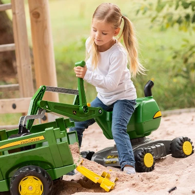 With the John Deere Digger kids can dig in the dirt with a BIG shovel! The excavator has a large digging shovel with dual action levers for easy scooping and dumping. The high impact blow molded resin body rotates 360 degrees and sits on 5 rolling resin wheels to easily move forward and backward.