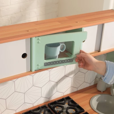 Create fun and exciting destinations for aspiring chefs with the retro KidKraft McKinney Toddler Play Kitchen with EZ Kraft Assembly™! Inspired by the mid-century modern trend, this play kitchen has everything little ones need to cook up hours of imaginative fun. Whether learning how to organize the refrigerator or remembering to wash their hands before cooking, this stylish kitchen not only offers up fun pretend play, but also teaches practical skills. Kids will be delighted when they discover that the knobs on the cooktop and oven make a fun clicking sound, and they’ll love pretending to create fun drinks with the play ice maker. The classic microwave offers up a fun alternative to cook food in an instant. Parents will love how fast and easy it is to assemble this play kitchen with our innovative EZ Kraft Assembly™ technology, which means less building time and more playing time!
