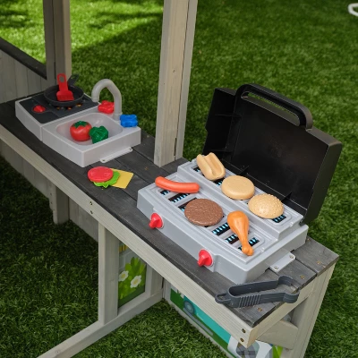 Time to fire up the grill and invite family and friends over! Kids and parents alike will love the openness of the wooden Patio Party Playhouse from KidKraft. With a door and expansive windows, there’s plenty of room to play and interact both inside and outside the house. In the barbecue extension area, use the grill to get cooking. Flame graphics will appear with the turning of the knobs. A total of 11 play food pieces are included so kids can grill up some outdoor favorites. Inside is a sink and burner for even more role playing. Keep guests busy with the new game feature—spinner blocks so you can mix or match to create your own wacky character. Designed to fit in with your yard’s aesthetic, this realistic-looking wood playhouse will keep kids entertained outdoors season after season.
