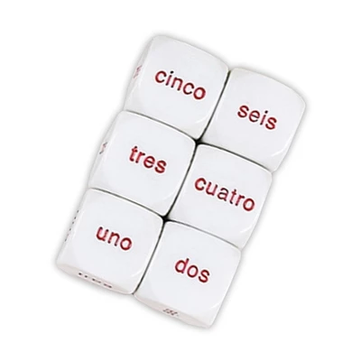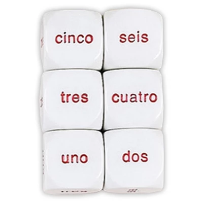 Six-sided Spanish Number Dice. Great for practicing number word recognition – a necessary skill for math! Includes number words from one to six (1-6). Add to your math lessons for a bilingual lesson. Dice measure 3/4″ (20mm) and feature white dice with red writing. Durable plastic construction. WARNING – CHOKING HAZARD: Small parts. Not intended for children under 3 years.