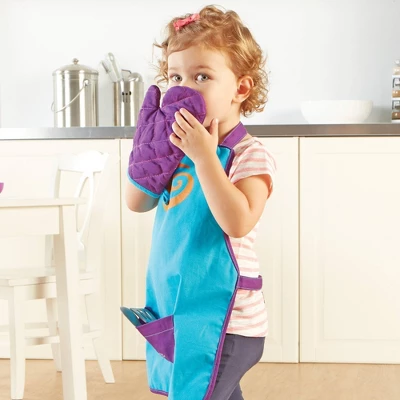 - Includes a toddler-sized apron, oven mitt, and a chunky, easy-to-hold plastic spatula and spoon
