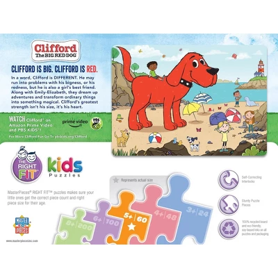Clifford the Big Red Dog plays with friends in the town square. This puzzle is 60 pieces and 19 inches x 14 inches in size. Look for The Right Fit® puzzles collection and make sure your little one gets the correct piece count and size for a good challenge for their age. This puzzle is the right fit for ages 4+.