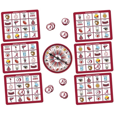 Play bingo with your favorite NCAA Team! This Alabama Bingo Game puts a college spin on the family favorite. Many of the symbols represent your favorite NCAA Team and other football memorabilia. Make all 9 matches and be the first to shout BINGO! This MasterPieces Bingo Game includes 1 spinner, 6 gameboards, and 84 custom tokens. Perfect for ages 3 and up.