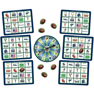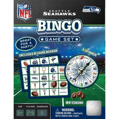 Play bingo with your favorite NFL Team! This Seattle Seahawks Bingo Game puts a football spin on the family favorite. Many of the symbols represent your favorite NFL Team and other football memorabilia. Make all 9 matches and be the first to shout BINGO! This MasterPieces Bingo Game includes 1 spinner, 6 gameboards, and 84 custom tokens. Perfect for ages 3 and up.