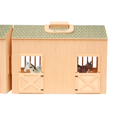 It’s a natural! With a decorative green “shingled” roof, this wooden stable provides a happy home for 4 plastic horses. When open, your little farmer or equestrian has easy access to the hayloft, with its wooden ladder, and 4 bales of “hay”. There’s a stall for each horse, lots of sliding and swinging doors and a folding corral to keep the horses in the barnyard. Sturdy wooden handles make it easy to take the fun along!