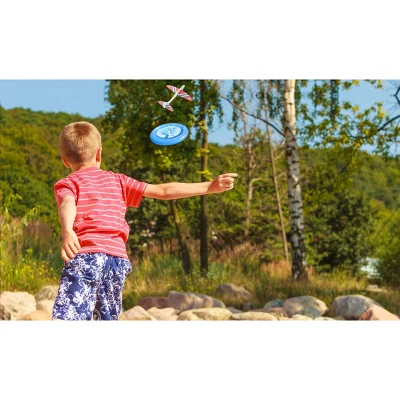 The easiest way to get a plane high up in the air! Just twist the plane onto the flying disc and throw! Once in the air, the plane will unwind, separating from the disc and fly on it’s own. Set Includes a durable foam plane and a traditional flying disc.