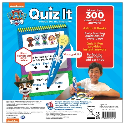 Your child will love to learn with this “instant answer” book and electronic pen set hosted by Chase, Skye, Marshall, Ryder, and more PAW Patrol pups! Four spiral-bound books contain hundreds of multiple-choice early learning questions including colors, letters, counting, shapes! Touch the pen tip to an answer and…bloop! The pen tells you if you’re right or wrong, with a blinking light, congratulations, or a supportive suggestion to try, try again.
