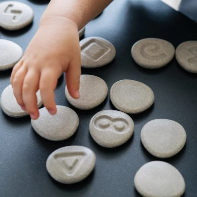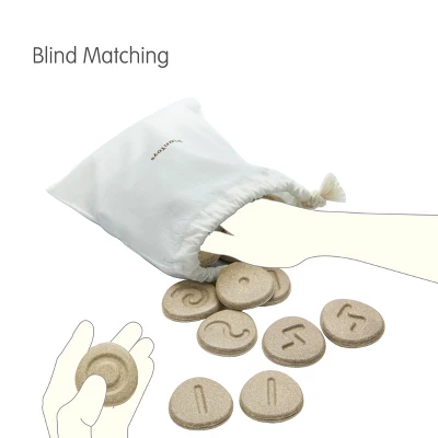 The Tactile Stones offer a wide range of opportunities for play! Complete with 24 stone pieces made from PlanWood and a fabric bag for storage, the set invites children to explore their sensory skills, sequence and pattern recognition, matching and categorizing skills and more. Experiment with the following activities: Matching Game, Memo Game, Matching Sequences, Stone Tracing, Line Drawing Practice, Stacking Game, or Blind Matching Game! These stones are also compatible with dough for imprinting and stamping. Playing cards are available for download online.