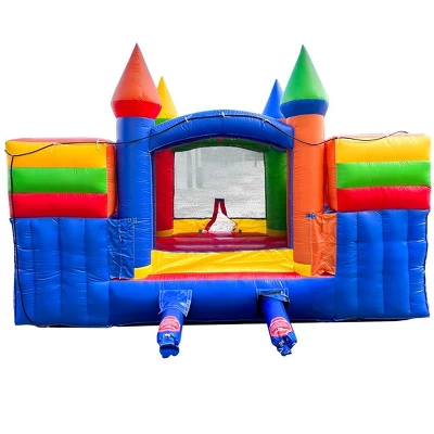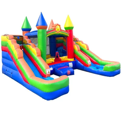 Introducing our castle bounce house with 2 inflatable slides from Pogo Bounce House! Our exciting castle-themed bounce house and slide combo features a spacious bouncing area and 2 slides that can be used wet or dry. Children will have loads of jumping fun and playing in the durable bounce house. For cooling summer fun, insert your garden hose into the bladder misting system and slide down onto the water slides. Our blow up castle bounce house is equipped with finger-safe, mesh netting all around the unit and at the entrance of the slide area for safety, as well as granting you the ability to provide proper supervision. Our inflatable jumpy house can accommodate a maximum of four (4) children at a time. Each unit comes with a storage bag, repair patches, and ground stakes. Includes a 90 day limited warranty on the inflatable. REQUIRES 1 HP COMMERCIAL BLOWER THAT IS NOT INCLUDED