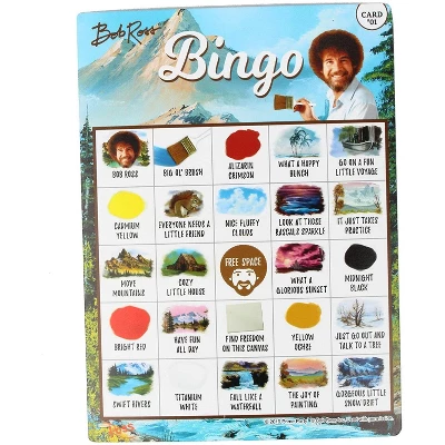 Enjoy the classic game of Bingo, a complete set with instructions packed into one convenient box. Everything you need to start playing right out of the box! Includes with 16 Colorful Bingo cards, 400 Bingo chips, a Bingo call sheet board, 42 calling cards, and instructions. Great for a Bob Ross birthday party, Bob Ross graduation party, art party, baby shower, and family game nights. Host a Bob Ross Bingo party any time. A great fun party game for adults and kids ages 8+!