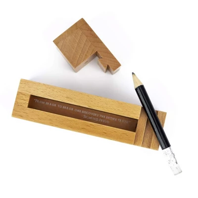 Can you discover how to open this clever little wooden trick box to release the pencil and the quote hidden inside? Warning: writing with this pencil may cause the odd Freudian slip! Part of Professor Puzzles Great Minds a suite of 3D Puzzle / Brain Games based upon histories best minds.