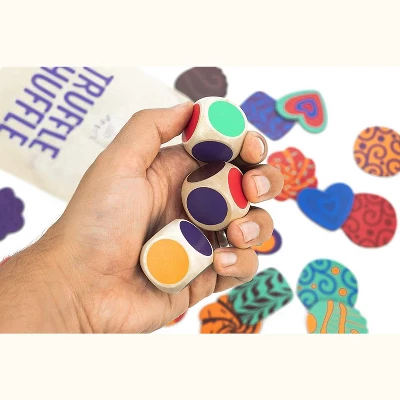 - GAME INCLUDES: Set contains 3 wooden dice, 41 wooden chocolate truffles, a cotton bag, and instructions.