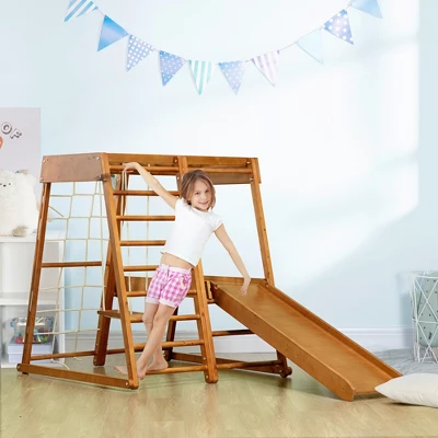 Get ready for years of fun with this 6-in-1 wooden climbing gym by Qaba. It Features a rock climbing wall, slide, monkey bars, rope ladder, wood ladder, and swing. Invite school friends, neighbors, and cousins to join in the fun. Solid wood construction is elegant and durable. The round corners and smooth surface ensure safety. Our climbing set is a great way for children to burn off energy, develop gross motor skills and keep fit, especially on rainy days inside.