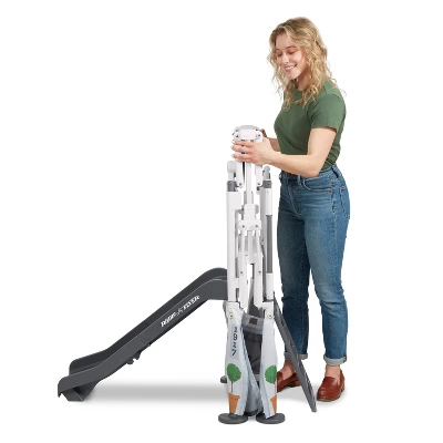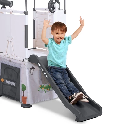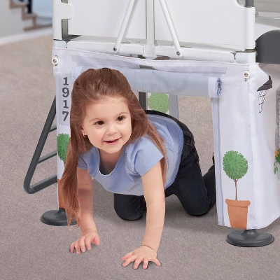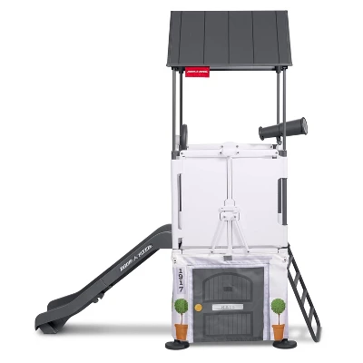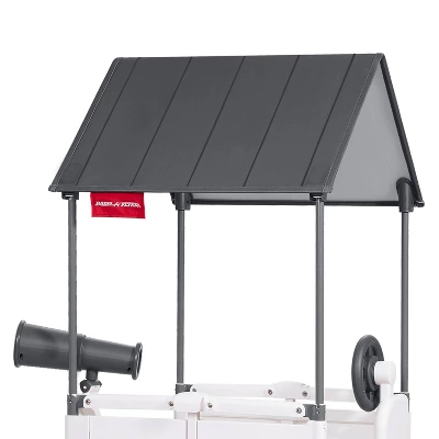 Radio Flyer’s Play & Fold Away Modern Farmhouse is a fun new playhouse that encourages active imaginative play! The unique folding mechanism allows this to be easily stored when not in use and the carrying handle makes this the most convenient climber for your family! Kids can create their own adventures on the sturdy platform with a fun telescope and steering wheel. The telescope swivels and pivots while the steering wheel rotates freely. The climbing ladder allows easy entry, and the built-in slide adds to the fun! Beneath the stable platform is a secret play space that features two doors and mesh windows. The fabric canopy is removable, and the canopy poles retract into the frame when not in use. Maximum weight capacity of 150 lbs. Recommended for ages 2 – 5 years