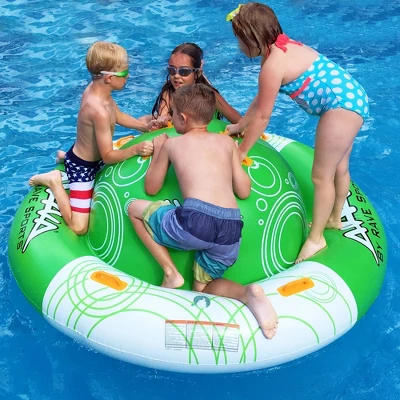 Climb and spin the summer away on the durable Rave Sports Saturn Rocker pool and lake toy. The Saturn Rocker inflatable children’s pool toy is perfect for use in a pool or lake and constructed of durable 12 gauge PVC vinyl. The Saturn Rocker also features 2 air chambers, 8 handles, and 1 anchor point. 5′ water depth required. 240 lbs. max user weight. Recommended for ages 6-12. 64″ x 64″ x 35″ inflated.