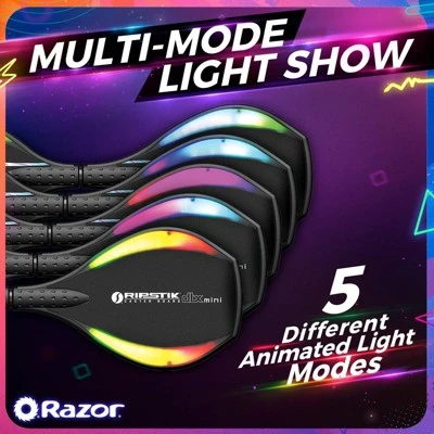 The RipStik DLX Mini Lightshow is the latest bright idea from Razor. This special edition caster board features multi-color LED’s built into the deck that perform your choice of 5 stunning animated light shows as you ride. Designed to project light both above and below the deck, the RipStik Mini DLX Lightshow provides an amazing visual for riders and spectators alike. The caster wheels are also packed with LED’s that add to the bed of light beneath the rider! In addition to all its lights, the RipStik DLX Mini Lightshow also features Razor’s patented dual inclined caster wheel design, which delivers all the carving fun. High performance urethane wheels and a unique torsion bar combine to deliver a smooth ride that doesn’t require riders to push off the ground to gain or maintain speed; just twist and go! As the name suggests, the RipStik DLX Mini Lightshow is also smaller than a traditional RipStik, designed to fit younger and smaller riders, or anyone who prefers a narrower riding stance. Lightweight, durable, and a ton of fun to ride, the RipStik DLX Mini Lightshow is one ride that will light up any kid’s face!