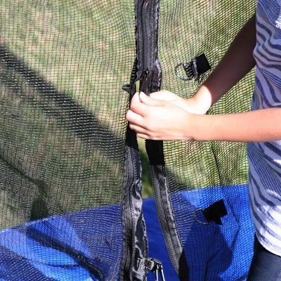 Make childhood memorable with the Skywalker Trampolines Skywalker Trampolines 8′ Round Jump-N-Toss Trampoline with Enclosure! This 8′ trampoline features a patented no-gap enclosure system which attaches to the jumping surface at every spring to eliminate dangerous gaps (Patent #RE45,182). The frame is made of rust-resistant galvanized steel, and uses a reinforced T-joint construction for extra frame stability. This 8′ trampoline includes 56 weather-resistant galvanized steel springs which are located on the outside of the enclosure net and covered with a vinyl-coated UV-resistant spring pad for safety. The whole family can join in on the fun with the included Jump-N-Toss game with six bean bags!