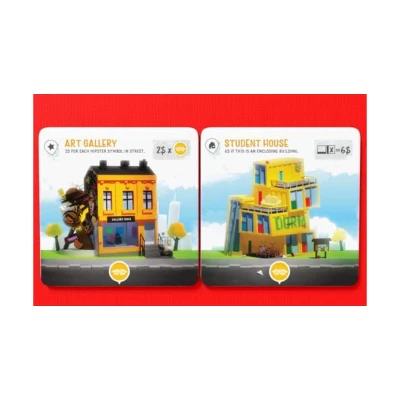 Streets is a tile-laying game where players build a city together, one building at a time.As you expand this quirky urban environment, you’ll need to find the best locations to maximize the value of your buildings and plan carefully to attract the growing crowds of hipsters, shippers, parents, and tourists who all bring vital extra income! Whoever cashes out with the biggest stack of loot after the last tile is laid will wind the game. Streets comes with two optional expansion modules and a challenging solo mode. Contents:47 building tiles48 people87 money tokens25 ownership signs48 business tokens7 consultant cards6 player aid cardsrulebook