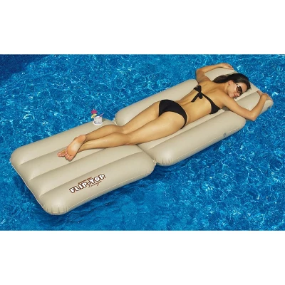Turn your backyard pool into a relaxing summer oasis with this tan flip-top pool lounger. Enjoy a refreshing drink with the built-in drink holder as you float around and soak up the sun! And if you don’t feel like lounging you can fold this float up into a chair and dangle your feet into the water.Features:Beige and white flip-top inflatable raftYou have the option to lay or sit while in the sunFeatures a convertible flip-top pillow and a built-in beverage holder Pillow can be folded under for a comfy propped up position or simply lay flat to soak up the sunThere is a PVC repair patch included Inflatable reads “Swimline Flip-Top Lounger”Recommended for ages 13 and up Dimensions: 8″H x 28″W x 88″D (inflated)Material(s): heavy-duty vinylNote: Ships flat and does not come inflated